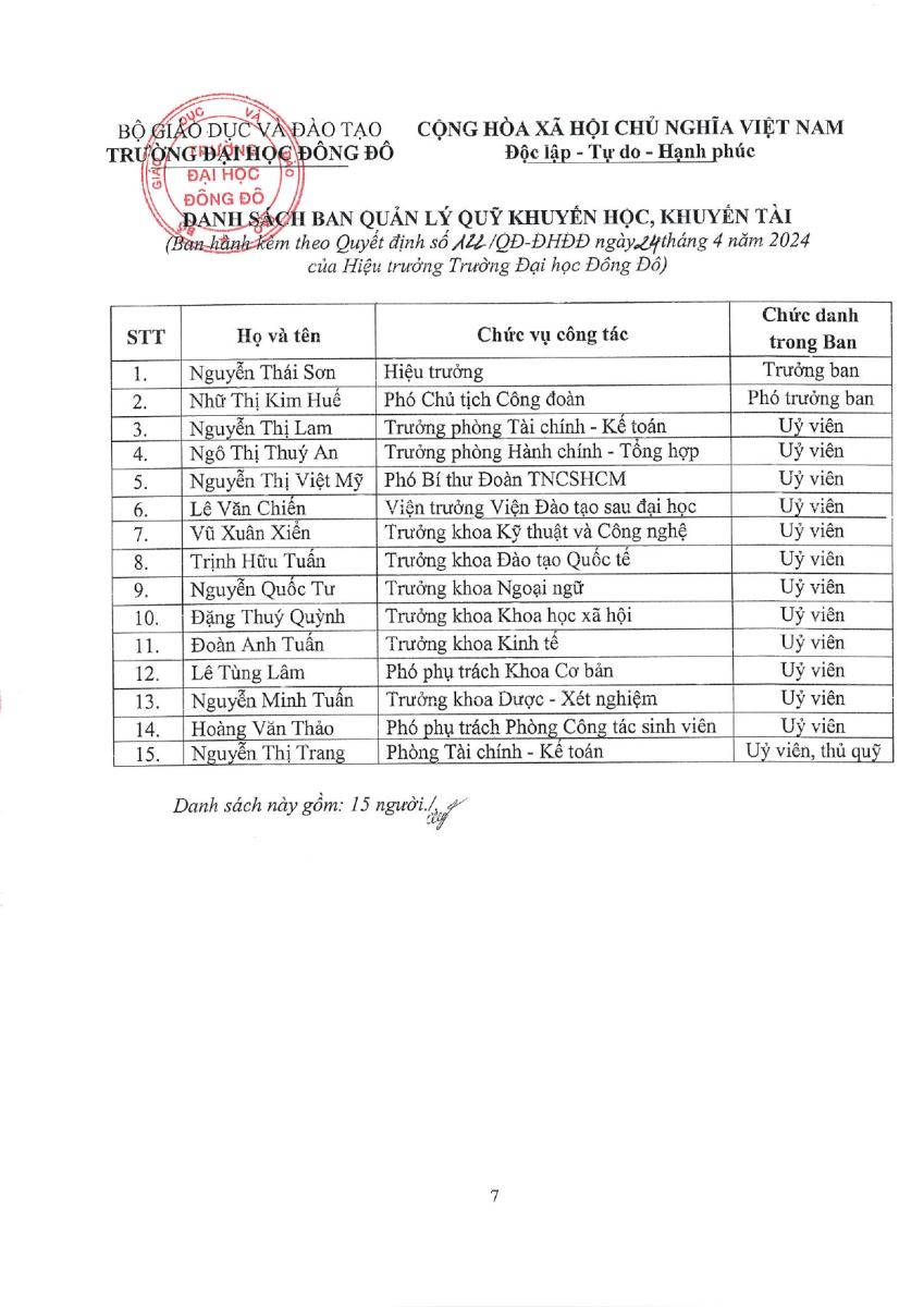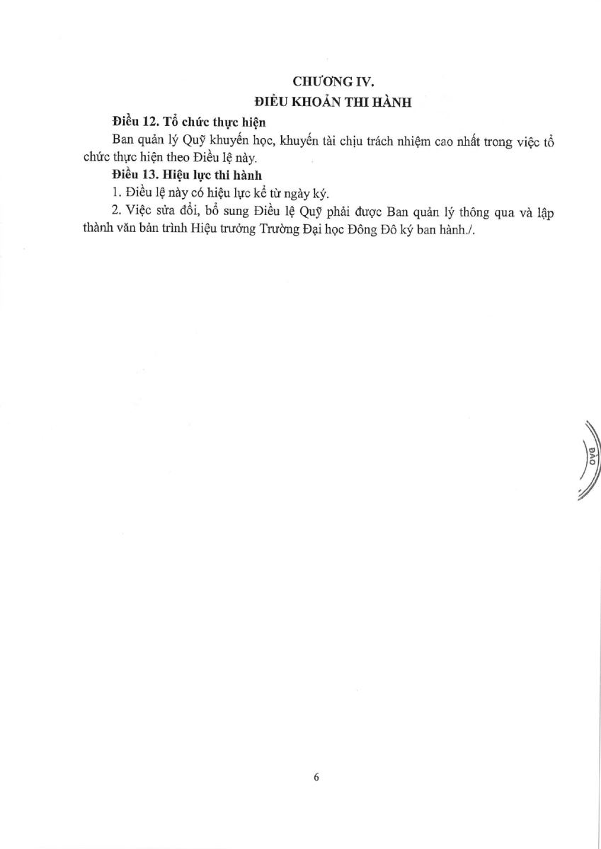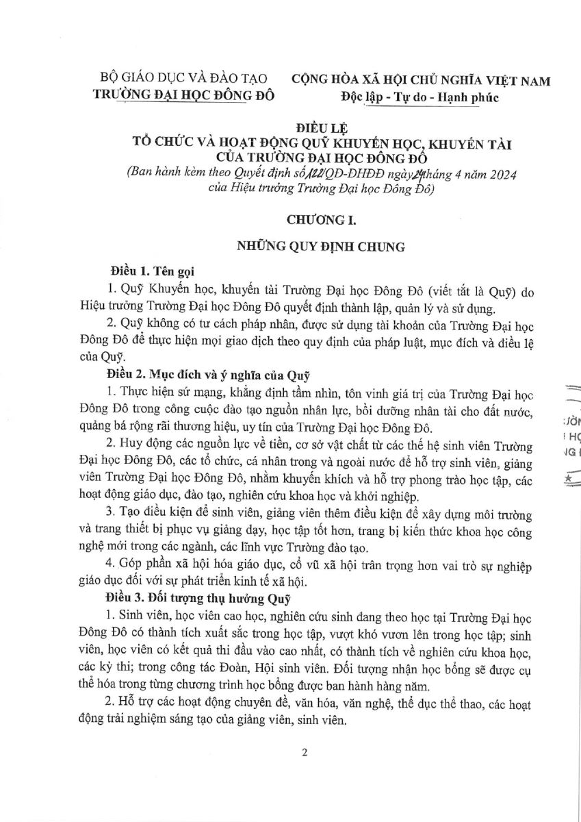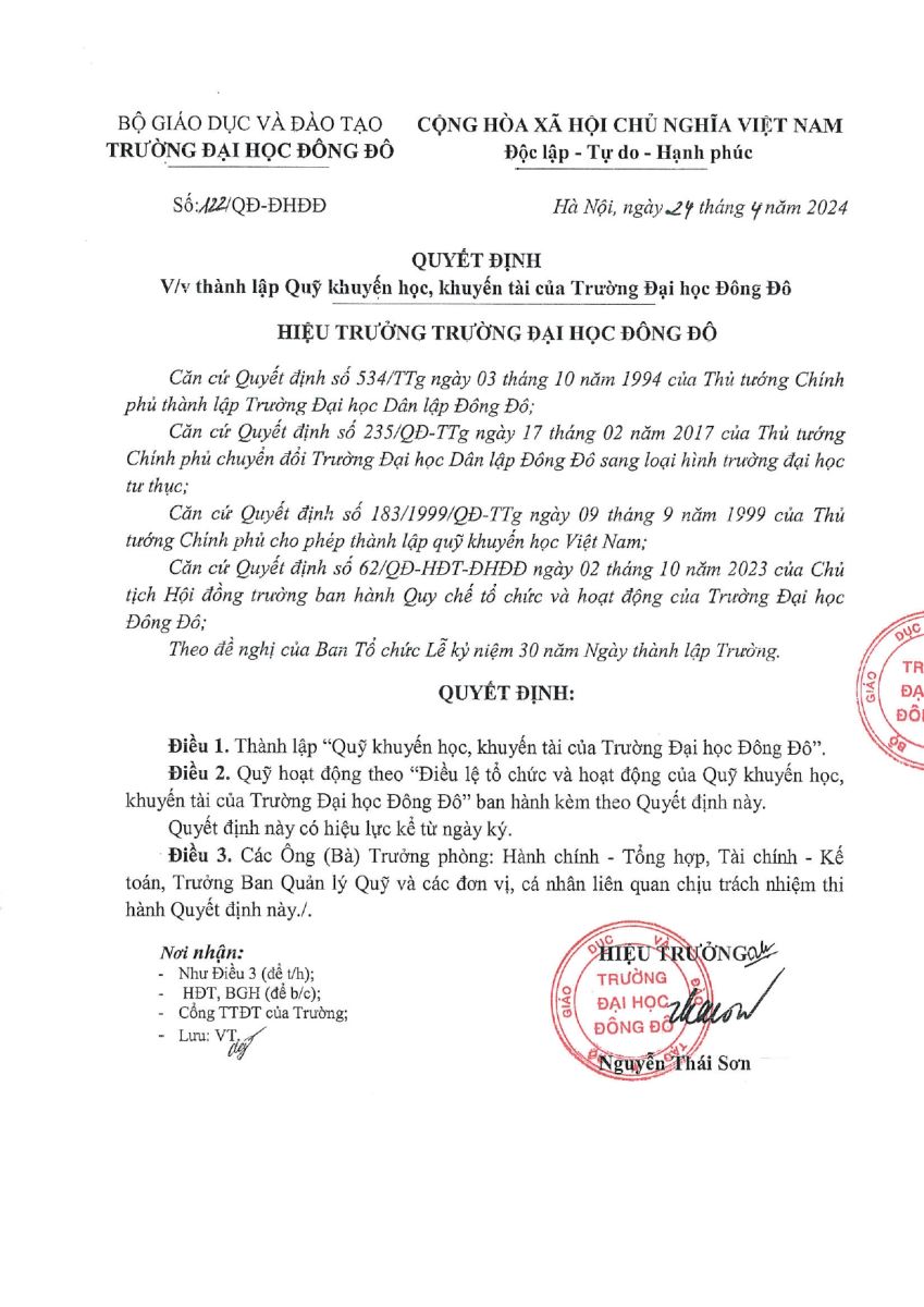 Ngày 25/04/2024, Hiệu trưởng Trường Đại học Đông Đô công bố quyết định thành lập Qũy khuyến học khuyến tài nhằm tôn vinh những giá trị hiếu học và vươn lên của sinh viên Đông Đô.